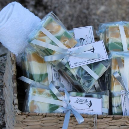 Lavandin, Romarin/Pin laricio, Immortelle, Miel de Corse, Géranium bourbon, Exfoliant citronné, Menthe, Épices, Rose, Lait de chèvre (Pascal) et Lait de chevre/Miel (Pasqualina)
