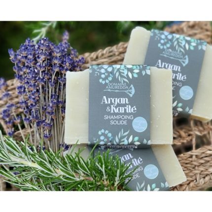 aux ingredients biologiques: l'huile végétales d'Argan, d'Olive, de Noix de Coco et Beurre de Karité, huiles essentielles de Lavandin Super et Romarin.