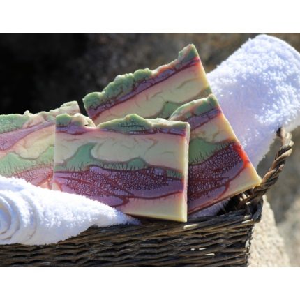 Savon naturel saponifié à froid aux huiles essentielles biologiques de GÉRANIUM Bourbon, huiles végétales biologiques d'Olive, de Noix de Coco et de beurre de Karité.