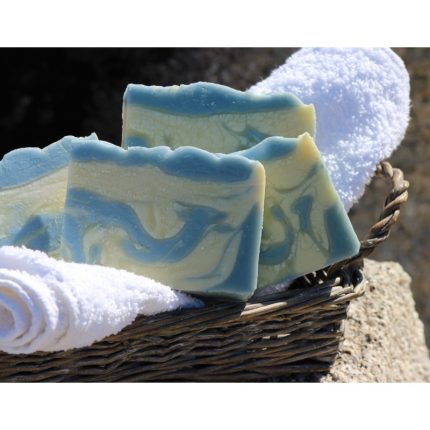 Savon naturel saponifié à froid aux huiles essentielles biologiques de ROMARIN à verbénone et de PIN Laricio, huiles végétales biologiques d'Olive, de Noix de Coco et de beurre de Karité.