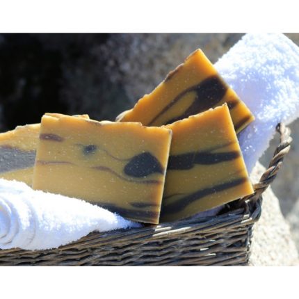 Savon naturel à l'IMMORTELLE CORSE saponifié à froid, aux huiles essentielles biologiques d'Immortelle, huiles végétales biologiques d'Olive, de Noix de Coco et de beurre de Karité.