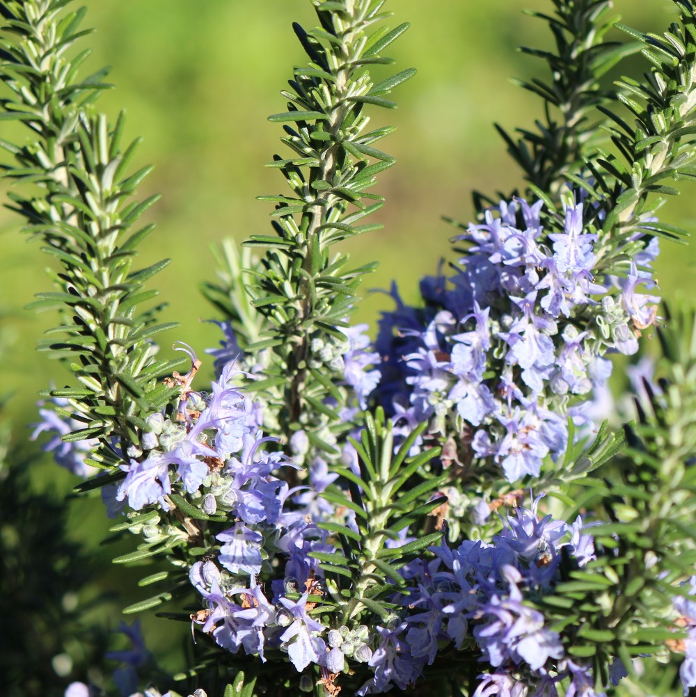 Les feuilles sont plus petites, plus étroites, d’un vert plus clair. Floraison: de début d’hiver jusqu’au mai, certaines variétés peuvent fleurir une deuxième fois en début d’automne. Fleurs: bleues-mauves. Préfère un endroit ensoleillé, dans un sol calcaire et bien drainé. Très efficace pour la sphère respiratoire (effets mucolytiques), hépatobiliaire, digestive et gynécologique, possède des propriétés antivirales. L’hydrolat du romarin corse est un des plus utilisés en aromathérapie dans les cures dépuratives. S’utilise en cuisine méditerranéenne, parfumerie. C’est une plante mellifère.